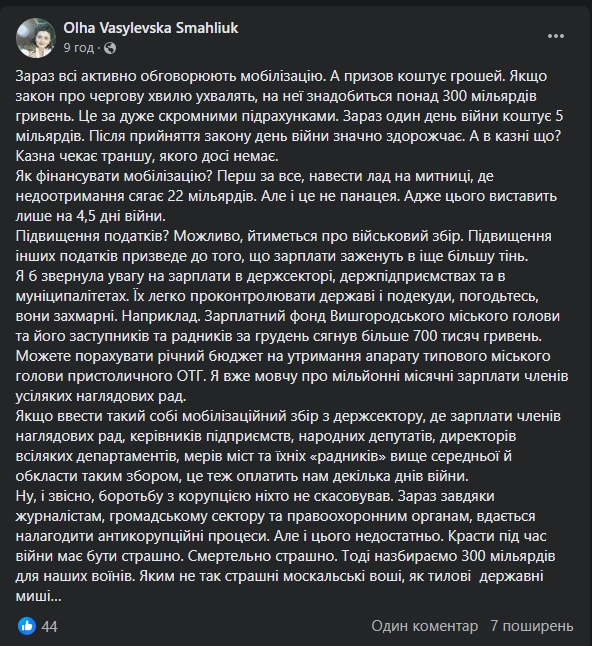 "Якщо закон про чергову хвилю приймуть, на неї знадобиться понад 300 мільярдів гривень. Це за дуже скромними підрахунками. Зараз один день війни коштує 5 мільярдів. Після ухвалення закону день війни значно подорожчає. А в казні що? Казна чекає траншу, якого досі немає ", - написала нардеп.