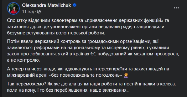 "Спочатку віддячили волонтерам за "привласнення державних функцій" та затикання дірок, де уповноважені органи не давали ради, і запровадили безумне регулювання волонтерської роботи. Потім ввели державний контроль за громадськими організаціями, які займаються реформами на національному та місцевому рівнях, і ухвалили закон про лобіювання, який в країнах ЄС побудований як механізм прозорості, а не контролю. А тепер на черзі люди, які адвокатують інтереси країни та захист людей на міжнародній арені "без повноважень та погоджень". Так переможемо? Як же дістала ця імітація роботи та постійні палки в колеса, коли на кону, і то без перебільшення, наше виживання"- написала Олександра Матвійчук.