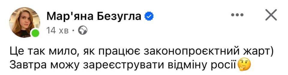 "Це так мило, як працює компактна законопроєктна провокація) Завтра можу зареєструвати відміну Росії. Але якщо серйозно, то зареєстрований нами з Галиною законопроєкт N11104 про кримінальну відповідальність за неуповноважене представництво України у міжнародних переговорах - прецедент апеляції до історії та тест на політичну дискусію", - написала вона.