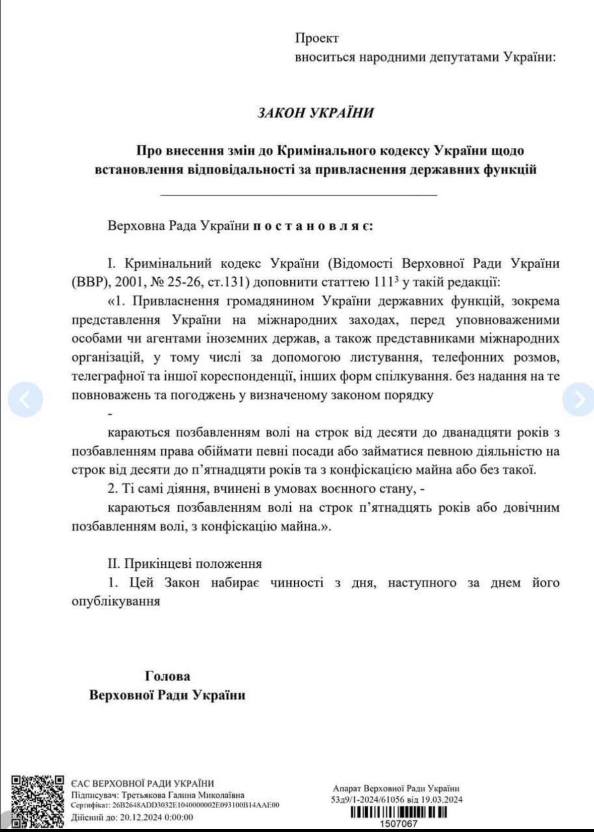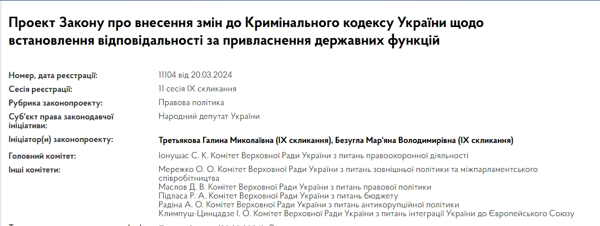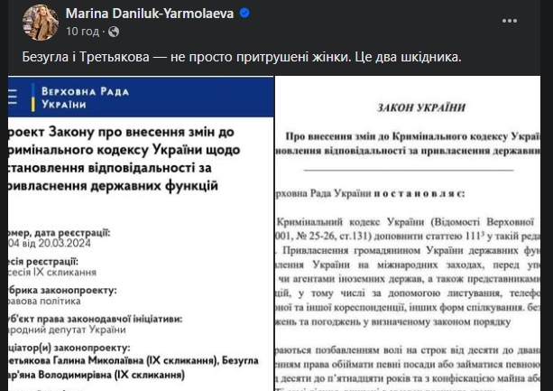 Народні депутати від "Слуги народу Мар'яна Безугла та Галина Третьякова зареєстрували в парламенті законопроект, що передбачає покарання у вигляді 12 років позбавлення волі за "представлення інтересів України за кордоном", без "повноважень та погоджень".