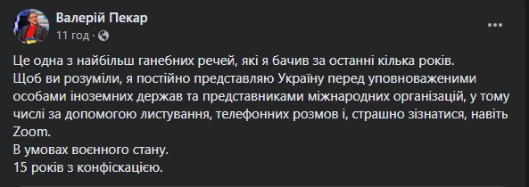 "Це одна з найбільш ганебних речей, які я бачив за останні кілька років. Щоб ви розуміли, я постійно представляю Україну перед уповноваженими особами іноземних держав та представниками міжнародних організацій, у тому числі за допомогою листування, телефонних розмов і, страшно зізнатися, навіть Zoom. В умовах воєнного стану. 15 років з конфіскацією", - написав Валерій Пекар.