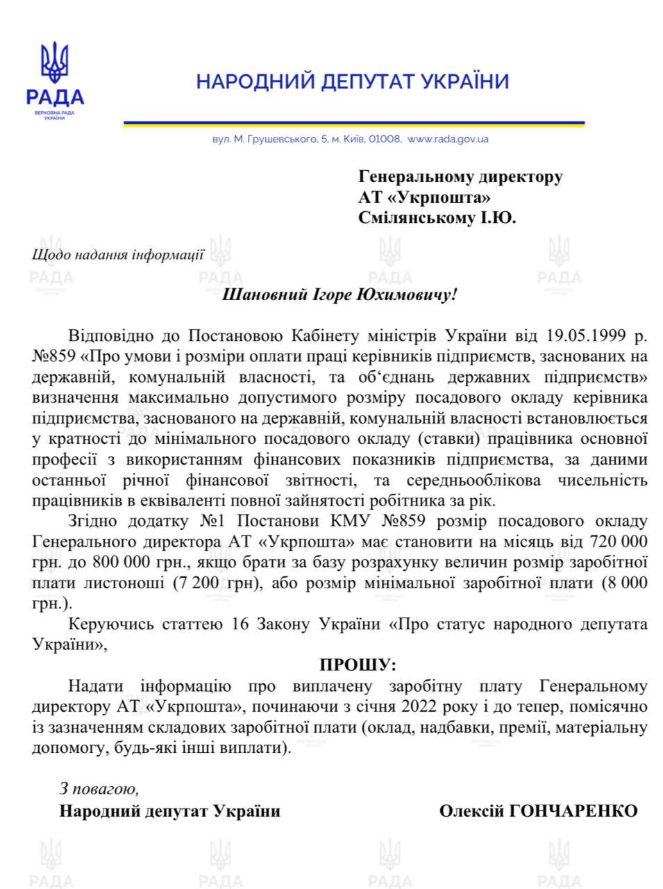 "Згідно додатку №1 Постанови КМУ №859 розмір посадового окладу Генерального директора АТ "Укрпошта" має становити на місяць від 720 000 грн. до 800 000 грн., якщо брати за базу розрахунку величини розмір заробітної плати листоноші (7 200 грн), або розмір мінімальної заробітної плати (8 000 грн)", - йдеться у запиті.
