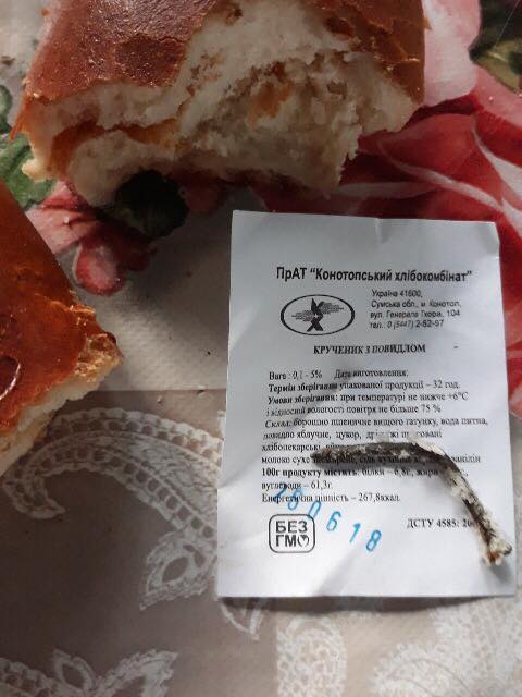 Виробник цікавого десерту - "Конотопський хлібокомбінат". Судячи з етикетки, булка була вироблена вчора. Чи постраждав хтось від такої начинки на даний момент не повідомляється.