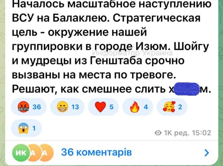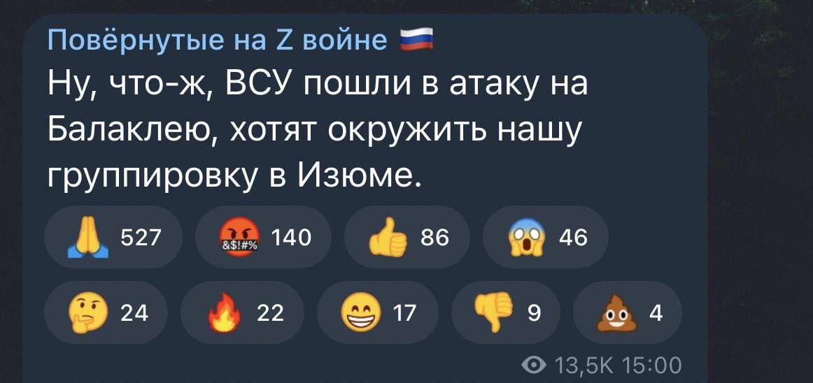 Про наступ Збройних сил України повідомляють харківські пабліки та російські пропагандистські ЗМІ. Водночас, офіційної інформації від Генштабу ЗСУ немає навіть у вечірньому зведенні.