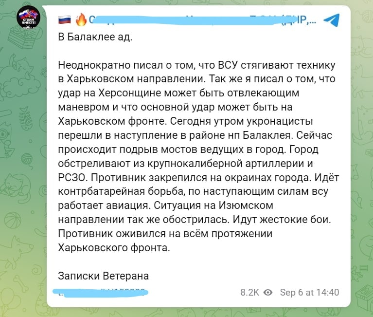 У вівторок, 6 вересня, з'явилися повідомлення про контрнаступ українських військових під Балаклією на Харківському напрямку.