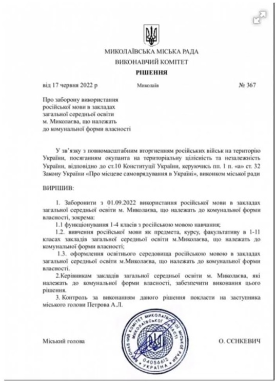 У Миколаєві з нового навчального року, 1 вересня, вирішили повністю заборонити російську мову у школах, зокрема й вивчення її факультативно.