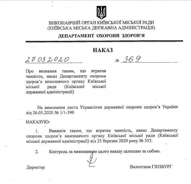 Про це йдеться в наказі Департаменту охорони здоров'я КМДА від 27 березня, яким володіє "Апостроф".