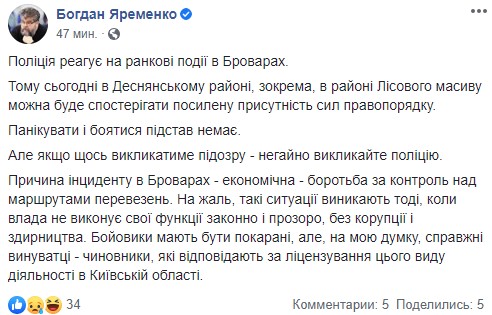 "Причина інциденту в Броварах - економічна - боротьба за контроль над маршрутами перевезень. На жаль, такі ситуації виникають тоді, коли влада не виконує свої функції законно і прозоро, без корупції і здирництва. Бойовики мають бути покарані, але, на мою думку, справжні винуватці - чиновники, які відповідають за ліцензування цього виду діяльності в Київській області", - написав він.