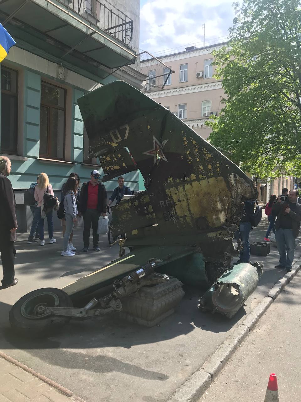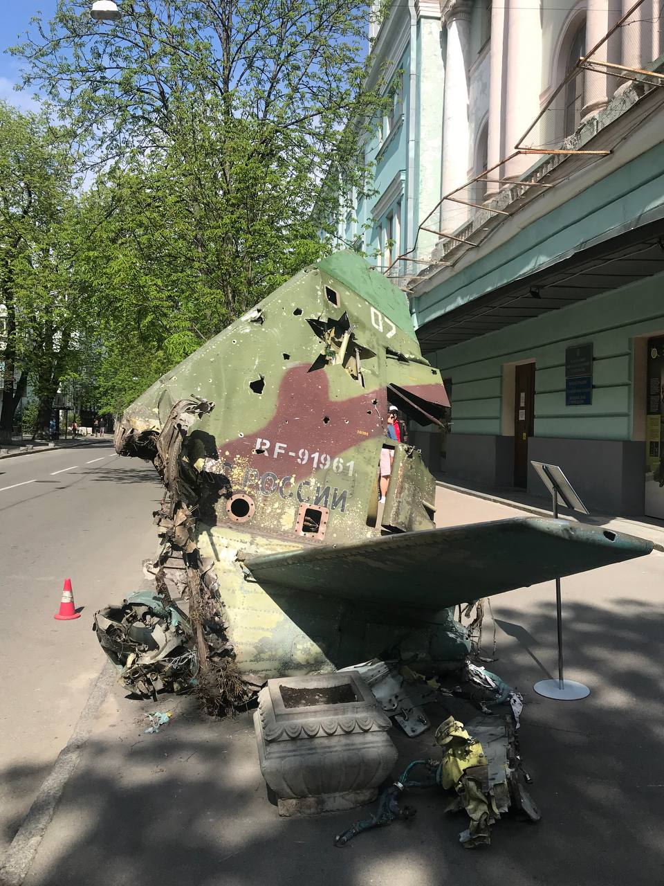 У Печерському районі Києва облаштували виставку розбитої російської техніки. Біля Маріїнського парку поставили збитий літак окупантів.