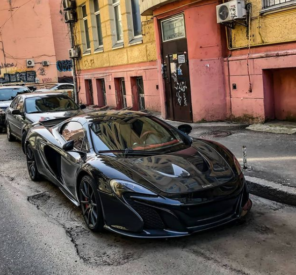 Власник розкішного суперкару McLaren 650S Spider залишив його у підворітті в центрі Києва. Авто чорного кольору на тлі розбитого асфальту і занедбаного двору з яскравими колись стінами будинків виглядало, наче гість.