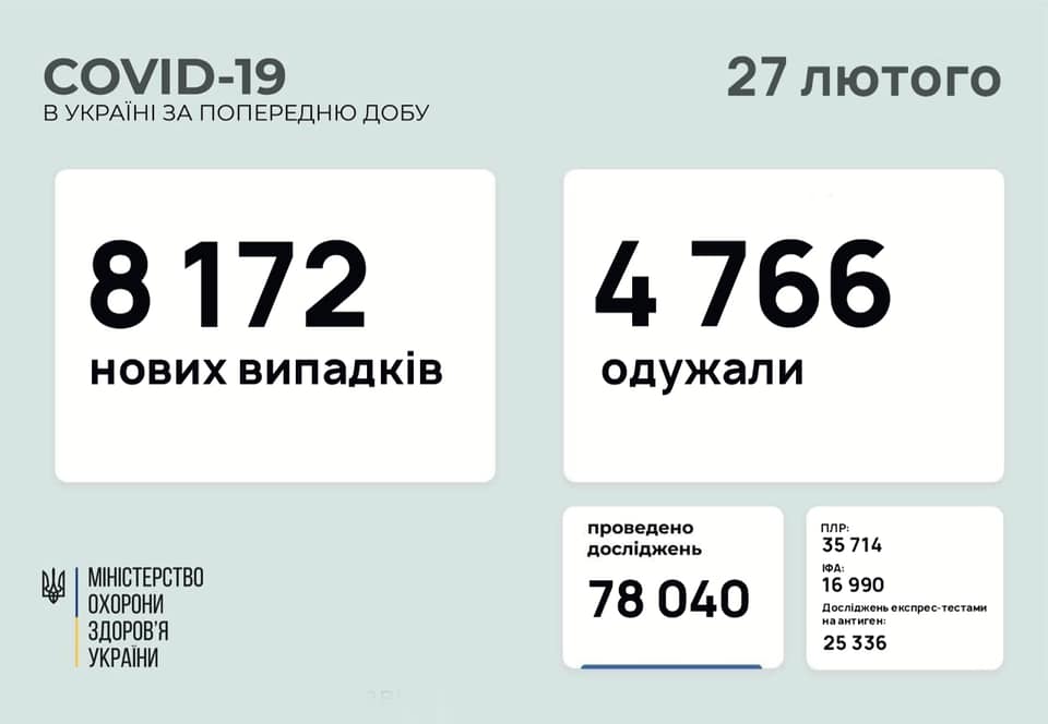 В Україні за минулу добу, 26 лютого, зафіксовано 8 172 нових випадки коронавірусу.