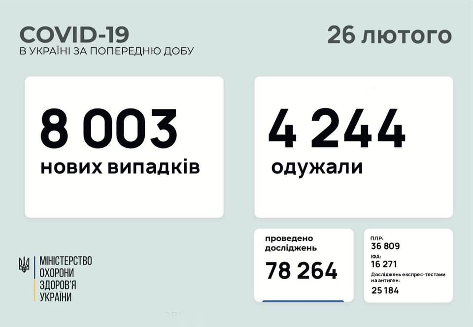 В Україні за минулу добу, 25 лютого, зафіксовано 8 003 нових випадки коронавірусу.