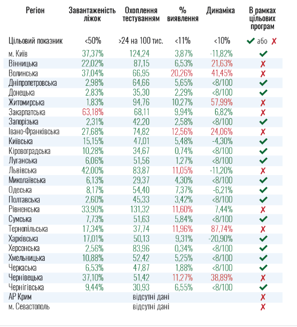 Згідно з оприлюдненими даними, у Вінницькій, Волинській, Житомирській, Закарпатській, Львівській, Івано-Франківській, Рівненській, Тернопільській, Чернівецькій областях перевищено допустимий відсоток виявлення нових хворих на коронавірус та (або) зростання динаміки, а в Закарпатській області виявлено занадто велику завантаженість лікарень.