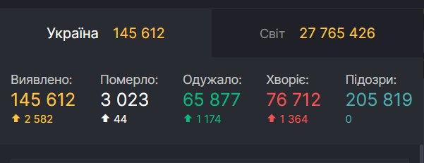 Всього в Україні станом на 10 вересня виявлено 145 612 хворих на коронавірусну хворобу. Від ускладнень, викликаних коронавірусом, вже помер 3023 українців.