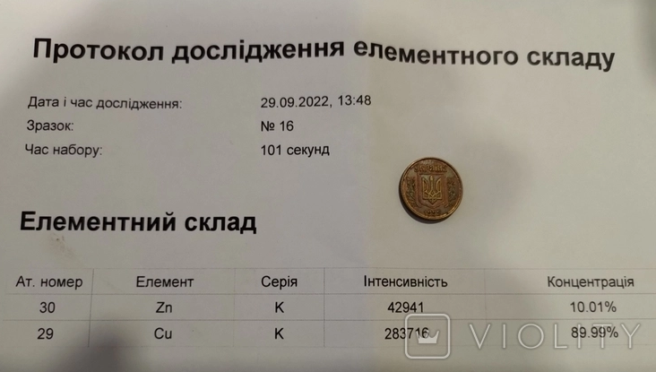Власник монети зазначає, що вона зроблена не зі звичного складу. Замість стандартної низьковуглецевої сталі з гальванопокриттям латунню її випустили з томпаку на основі міді. Автор публікації опублікував протокол дослідження елементного складу.