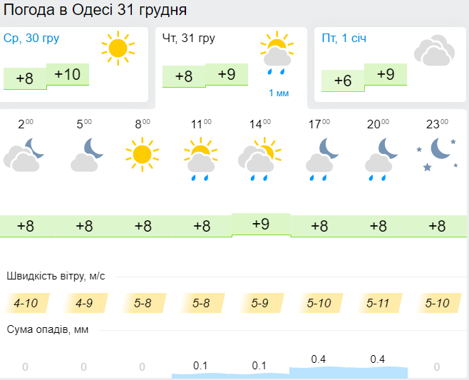 У четвер, 31 грудня, опади у вигляді дощу очікуються в Хмельницькій та Вінницькій областях, на решті території - без опадів.