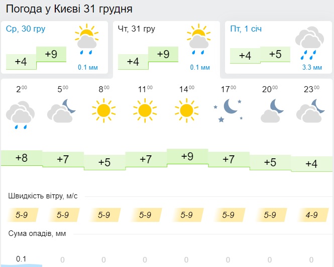 • У Києві на Новий рік очікується хмарна погода, температура повітря вночі + 1°, вдень + 7°.