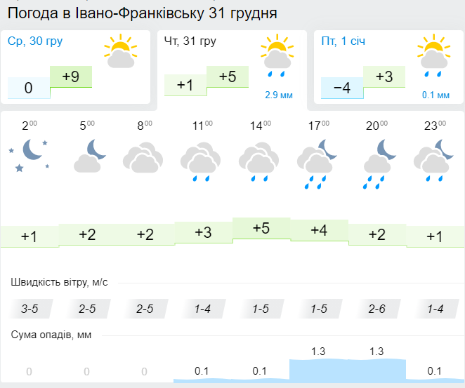 • У Хмельницькому 31 грудня вночі + 2°, вдень + 5°, дощ.