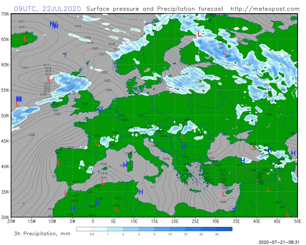 У середу, 22 липня, атмосферний фронт принесе похолодання в північних і деяких центральних областях України, місцями на території країни очікуються дощі.