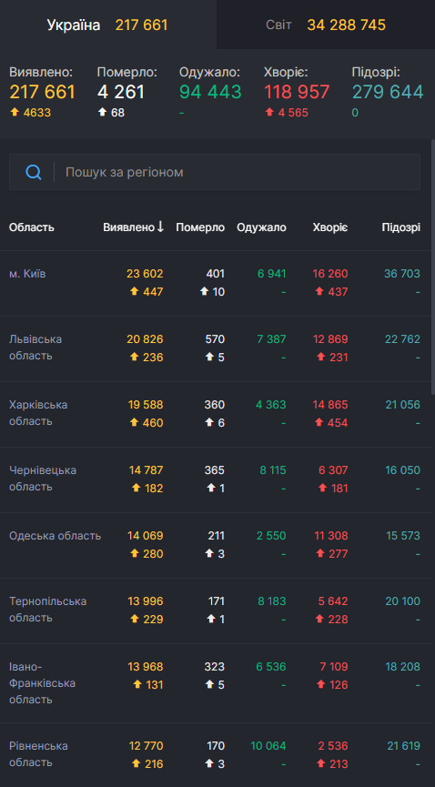 За минулу добу, 1 жовтня, коронавірус діагностували у 4 633 українців, що стало новим антирекордом за кількістю щоденного приросту хворих з COVID-19. Загальна кількість хворих в країні станом на п'ятницю, 2 жовтня, збільшилася до 217 661 особи.