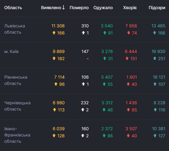 Серед випадків захворювання лідирує Львівська область - там виявлено 11 308 хворих. Далі йде Київ (9 869) та Рівненська область - 7 114 випадків.