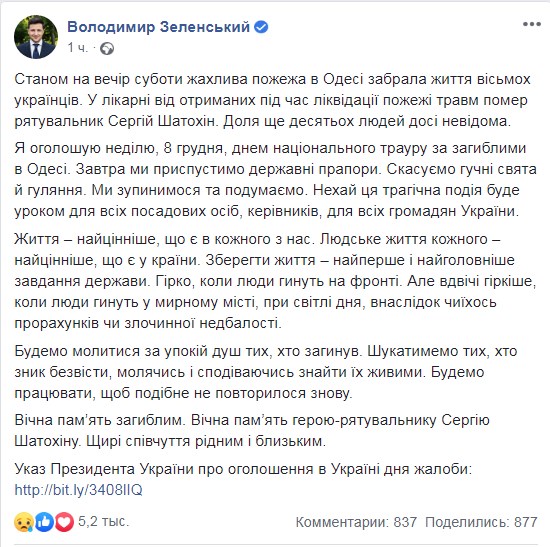 "Станом на вечір суботи страшна пожежа в Одесі забрала життя восьми українців. У лікарні від отриманих під час ліквідації пожежі травм помер рятувальник Сергій Шатохін. Доля ще десяти чоловік до цих пір невідома", - йдеться в заяві.