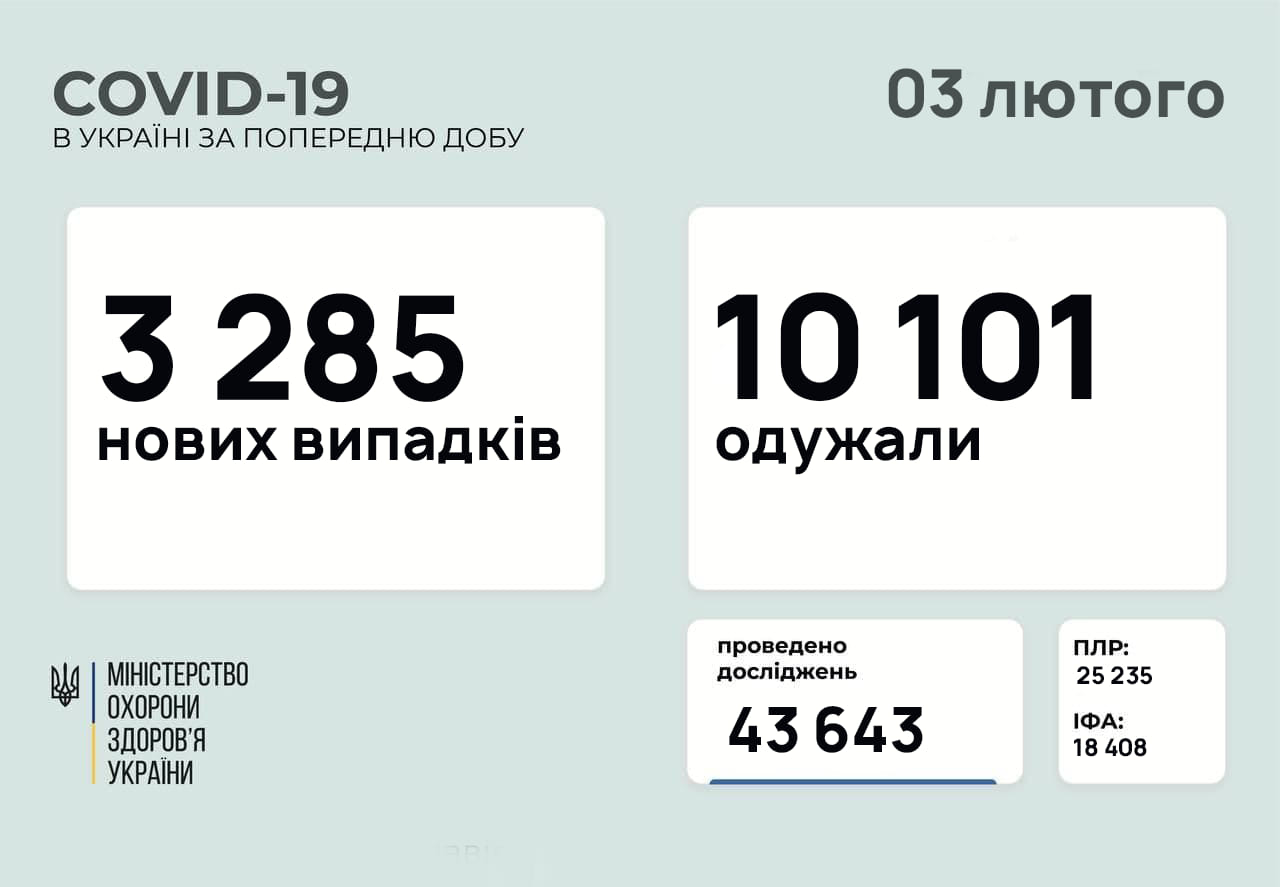 В Україні за минулу добу, 2 лютого, зафіксовано 3 285 нових випадків коронавірусу, померли 165 людей.