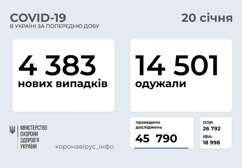 В Україні за минулу добу, 19 січня, зафіксовано 4 383 нових випадки коронавірусу, померло 212 осіб.