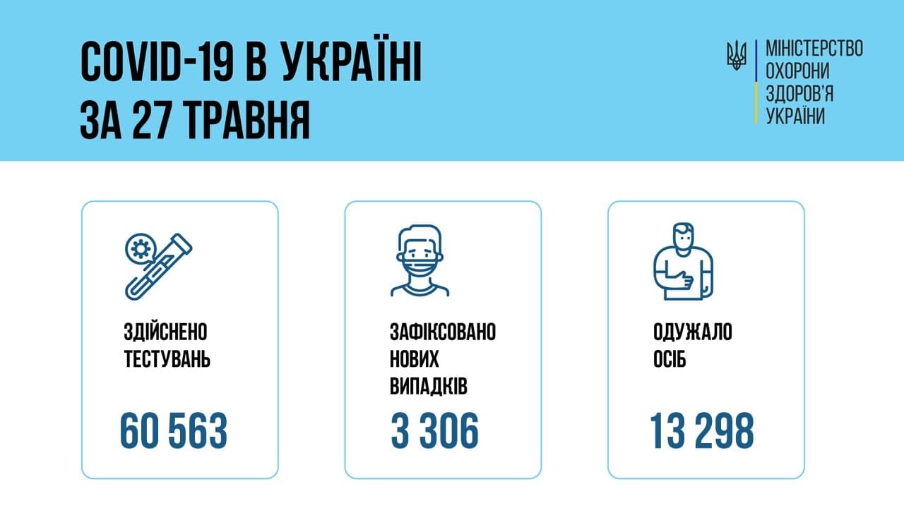 В Україні за минулу добу, 27 травня, зафіксовано 3 306 нових випадків зараження коронавірусом, померли 156 осіб.
