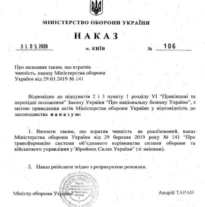 Новий глава Міноборони Андрій Таран скасував наказ, підписаний міністром оборони Степаном Полтораком, в якому були прописані основні принципи організації об'єднаного керівництва силами оборони і військового управління в Збройних Силах України, і представлена схема перспективної системи.