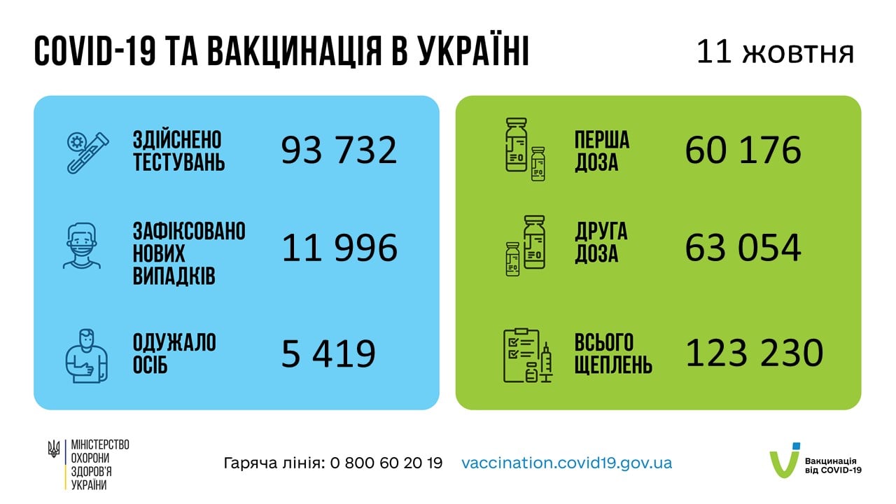 В Україні за минулу добу, 11 жовтня, зафіксовано 11 996 нових підтверджених випадків коронавірусної хвороби COVID-19 (з них дітей – 1 262, медпрацівників – 227).