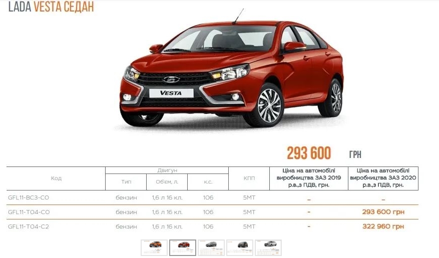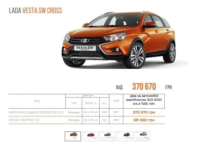 Автомобілі доступні в різних версіях і комплектаціях. Найдешевша Lada української зборки - це базова Granta з 98-сильним мотором і 4-ступінчастою автоматичною КПП. Її ціна - 216 530 грн. Найдорожчий автомобіль - Vesta SW Cross 18 на "механіці" за 381 680 грн.