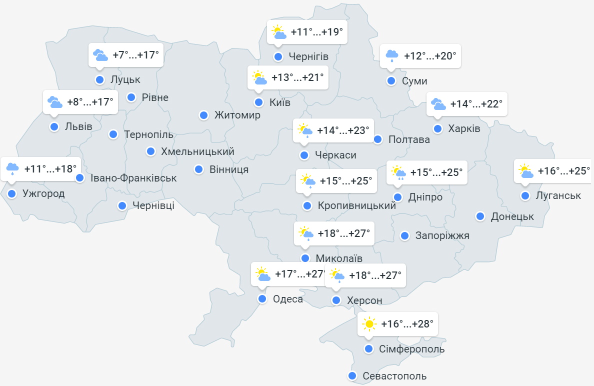 Тим часом у Миколаївській, Одеській, Херсонській областях температура повітря вдень обіцяє бути до +27 °С, а в Криму - до +28 °С. У Львівській області температура повітря вночі +6...+9°С, вдень +13...+17°С.