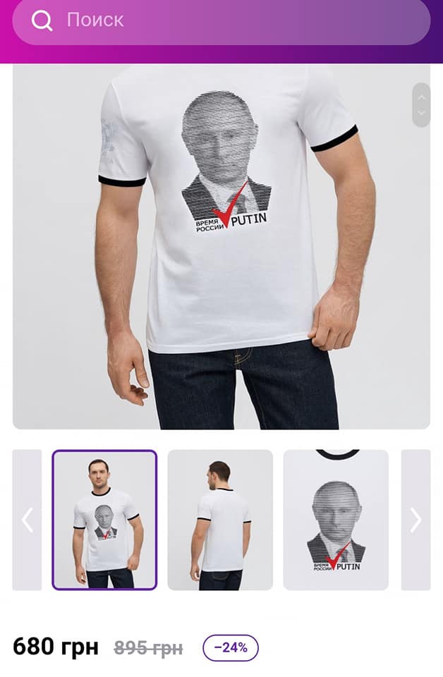 "Нарешті! А то ми не знали, де купити футболку з Путіним. Або набір для вишивання Путіна. Або може хочете футболку Поліція Росії? А За ВДВ? А може хочете двоголову курку? А герб СРСР? Тут все є! І ціни в гривнях! Яка радість ", - іронізує він.
