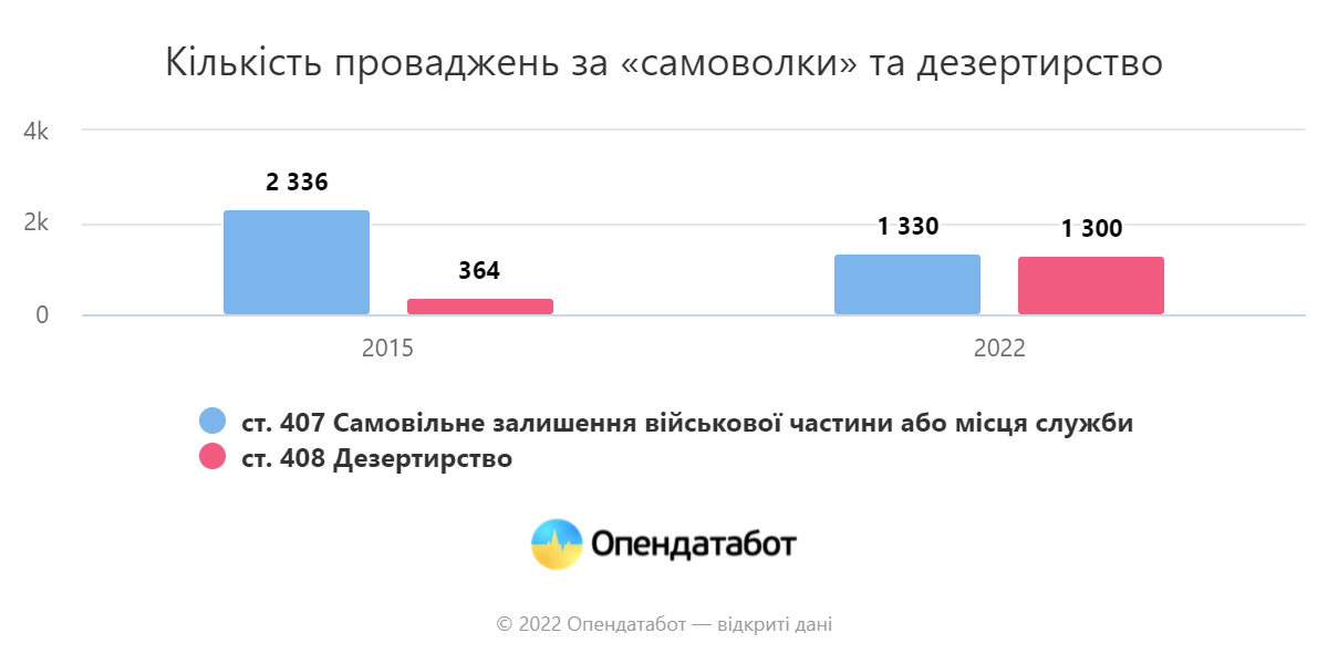 За перші півроку 2022 року всього було зареєстровано 2630 проваджень щодо тих військових, які залишили місце своєї служби без дозволу командира. З них 1330 проваджень було відкрито за ст. 407 КК України ( самовільне залишення військової частини чи місця служби), ще 1300 було відкрито за ст.408 КК України (дезертирство).