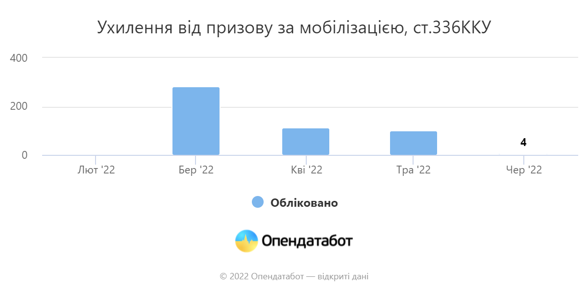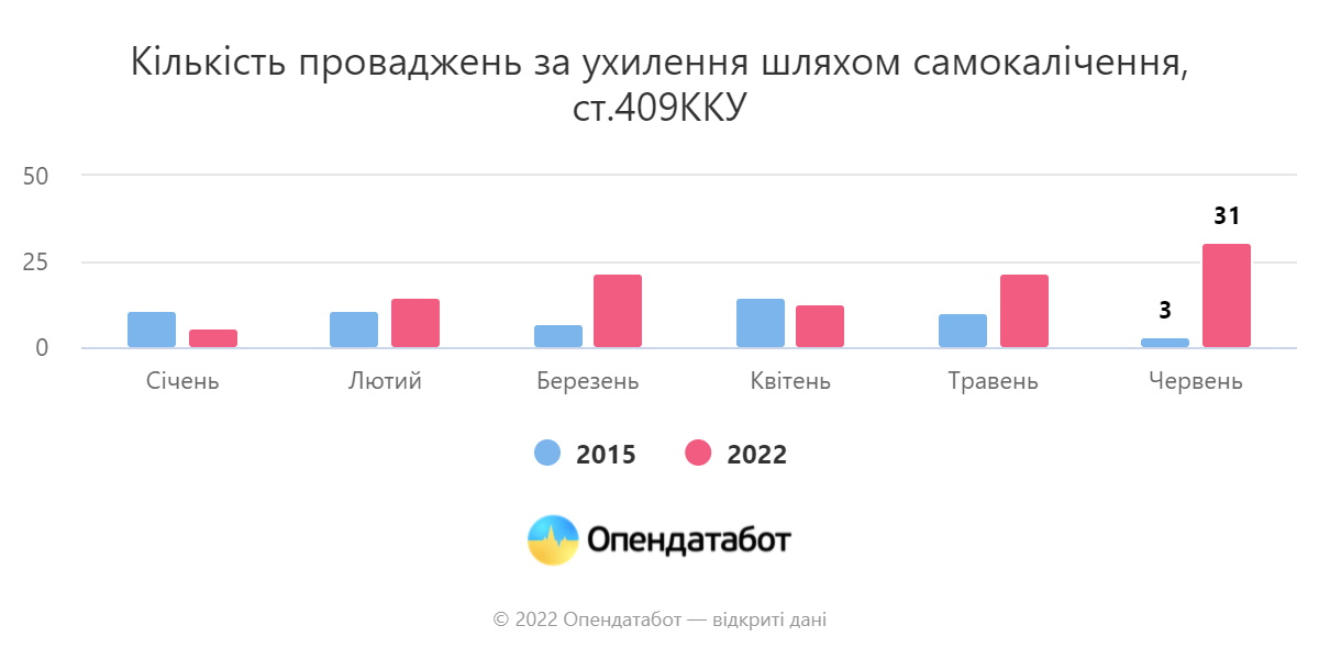 Також за перше півріччя 2022 року вдвічі збільшилася кількість проваджень за статтею 409 (Ухилення від військової служби шляхом самокаліцтва чи іншим способом).
