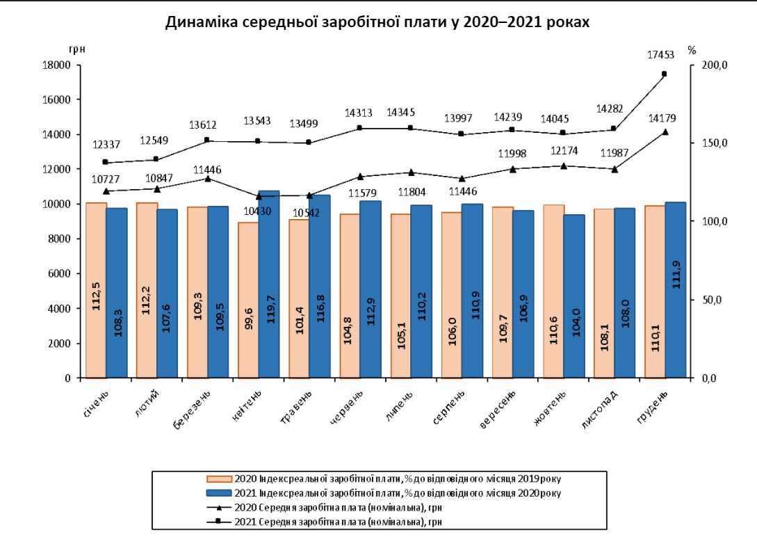 Зокрема, середня номінальна зарплата штатного працівника підприємств, установ чи організацій у грудні була на рівні 17 453 гривень, а це на 3 171 гривень у порівнянні з листопадом. Таким чином, за грудень середня номінальна заробітна плата зросла на 22,2%, а за рік - на 23,1%.