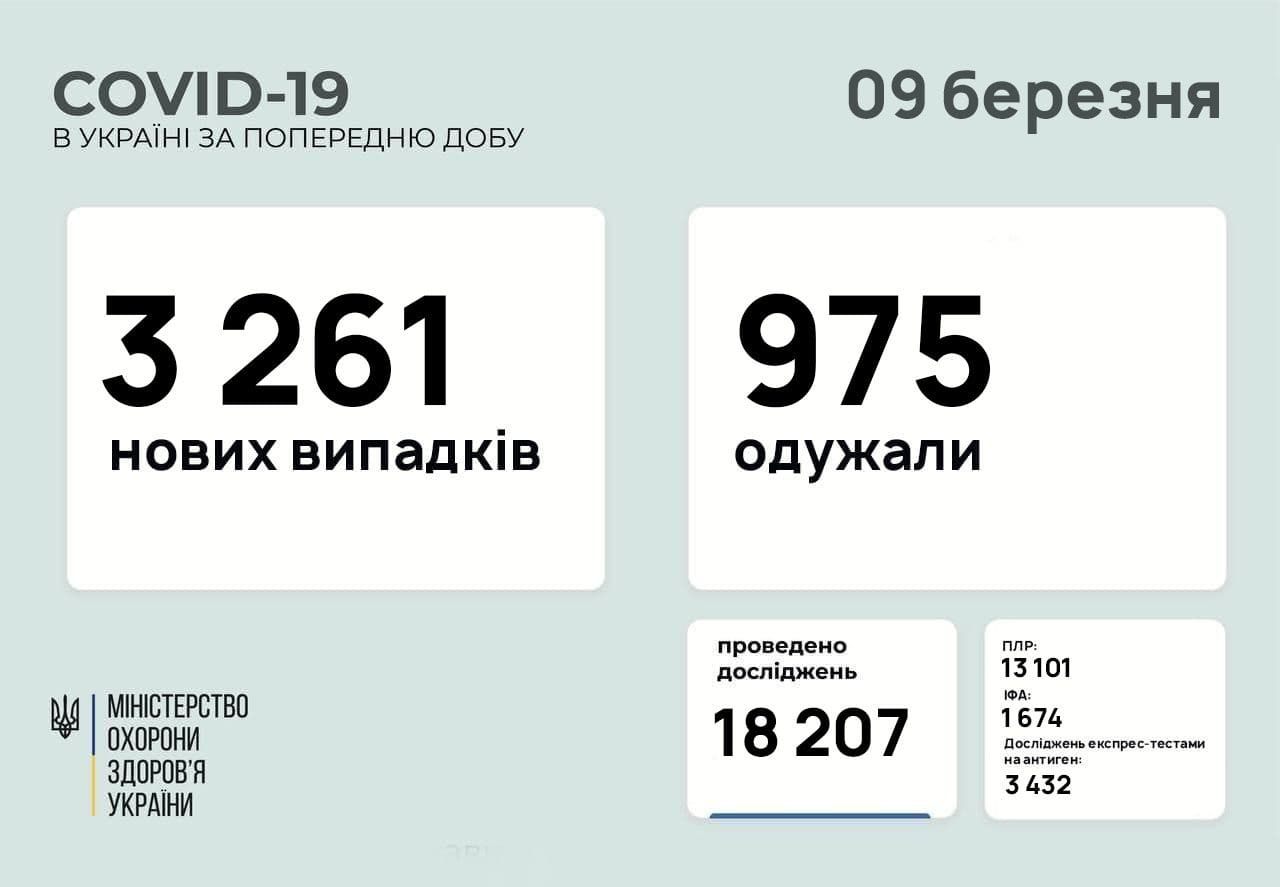 В Україні за минулу добу, 8 березня, зафіксовано 3 261 новий випадок коронавірусу.