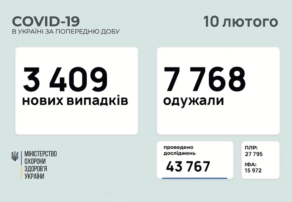 В Україні за минулу добу, 9 лютого, зафіксовано 3 409 нових випадків коронавірусу, померли 163 людини.