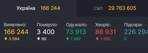 В Україні за добу, 16 вересня, зафіксували 3 584 нових випадки зараження коронавірусом, що стало новим антирекордом. Всього вірус в країні діагностували у 166 244 пацієнтів.