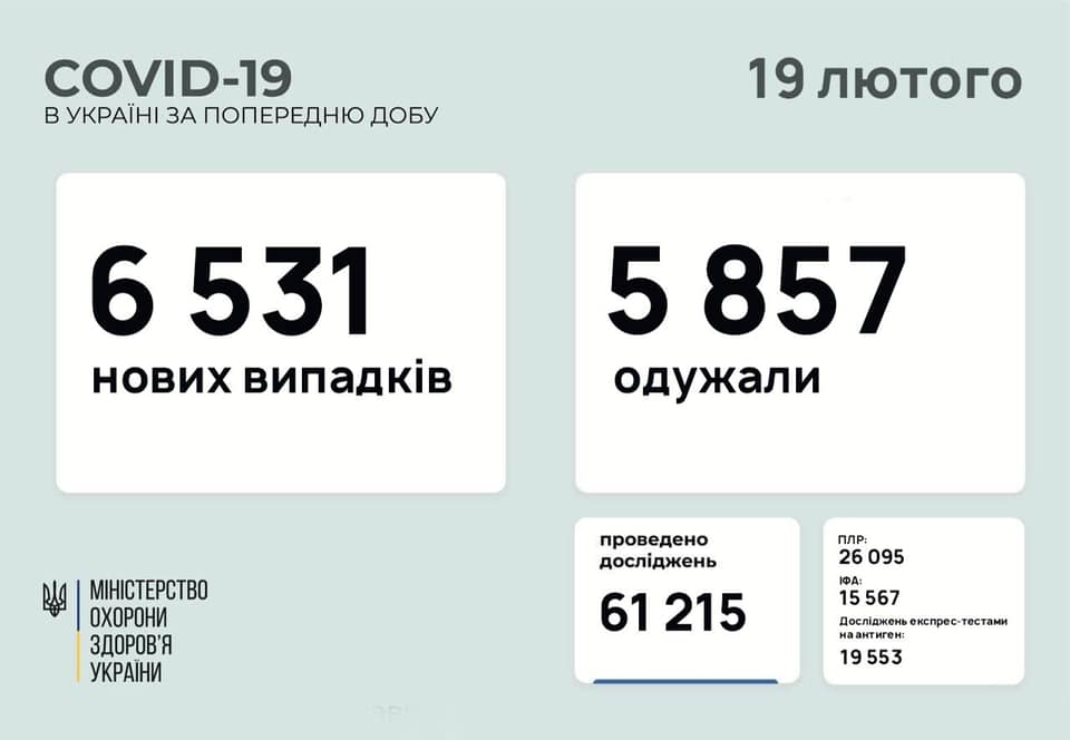 В Україні за минулу добу, 18 лютого, зафіксовано 6 531 новий випадок коронавірусу.