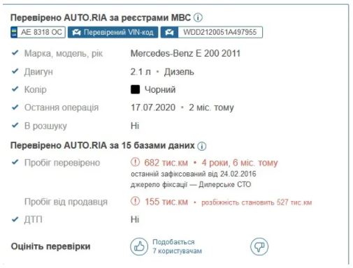Опис автомобіля зазначає, що пробіг седана становить 155 тисяч кілометрів, причому одометр показує ще менший показник. Перевірка за базою даних даного автомобіля показала, що насправді ця машина за дев'ять років пройшла на 527 тисяч кілометрів більше.