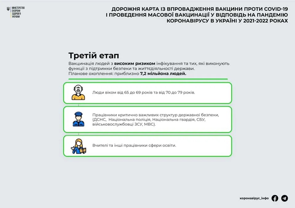 На наступному етапі вакцинувати будуть людей з високим ризиком інфікування і тих, хто виконує функції з підтримки безпеки і життєдіяльності держави. Всього планується охопити 7,2 млн осіб, серед яких: