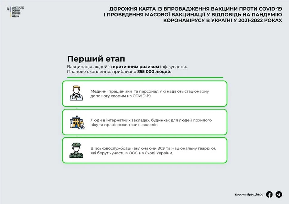Планується, що першими вакцину від коронавірусу отримають близько 335 тисяч осіб, діяльність яких пов'язана з критичним ризиком інфікування. Зокрема це: