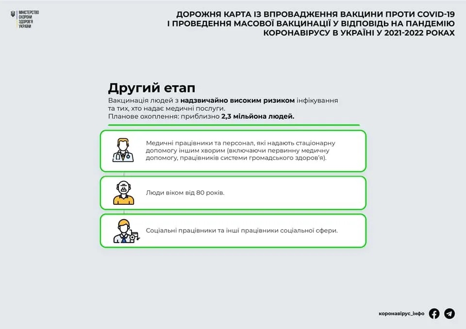 На другому етапі планується охопити 2,3 млн осіб. Серед тих, хто отримає вакцину - люди з надзвичайних ризиком інфікування, а також ті, хто надає медичні послуги, а саме:
