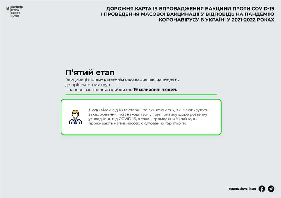 На останньому, п'ятому етапі вакцину отримають всі інші категорії населення, які не входять до пріоритетних груп. Планується, що охоплено буде 19 млн осіб, головним чином це люди віком від 18 років, які мають супутні захворювання, які знаходяться в групі ризику розвитку ускладнень від COVID-19, а також громадяни України, які проживають на тимчасово окупованих територіях.