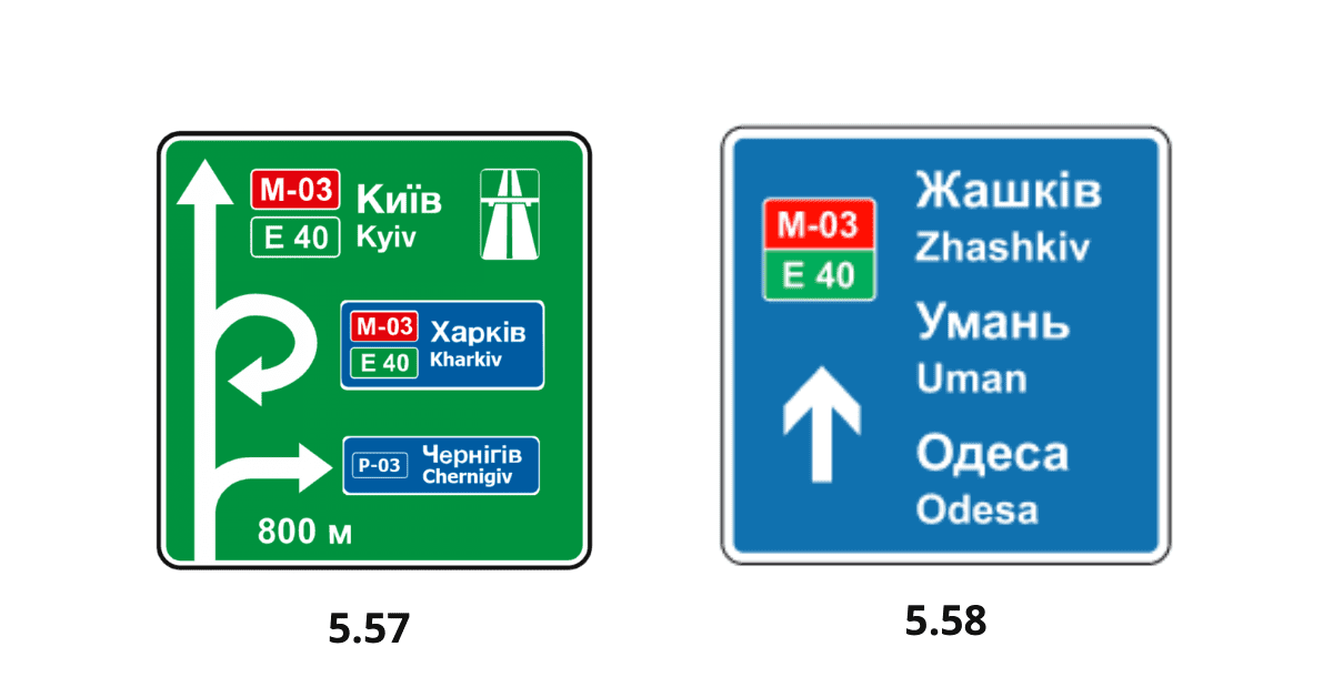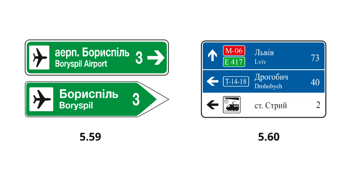 До інформаційно-вказівних знаків додано нові зображення знаків з застосуванням коричневого тла при позначенні обʼєктів туристичної інфраструктури, спортивних споруд, обʼєктів культурної спадщини, а саме: 5.57 "Попередній покажчик напрямків", 5.58 "Попередній покажчик напрямку", 5.60 "Покажчик напрямків".