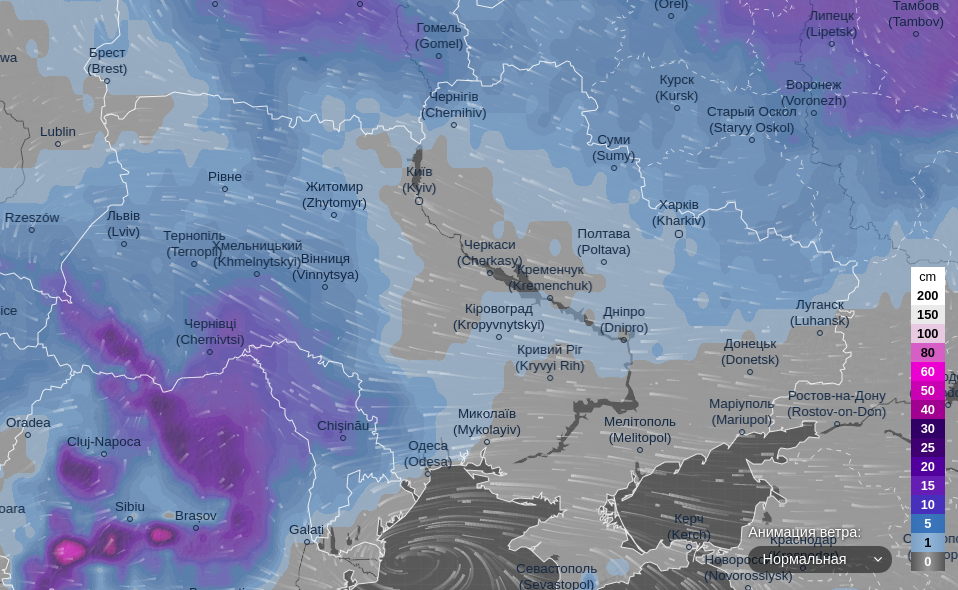 Висота снігового покриву 17 січня в Карпатах складе до 42 см, у Києві - до 5 см, в Чернігівській області - 3-4 см, Сумській - 1-3 см, Полтавській і Харківській - 9-17 см, Львівській і Тернопільській - 9-11 см, Дніпропетровській - до 23 см, Запорізькій - до 16 см, Житомирській, Вінницькій та Хмельницькій областях - 7-12 см, Черкаській - 6-9 см, Чернівецькій - 12-15, Івано-Франківській - 7-10 см, Рівненській - 4 -7 см, Одеській - до 5 см, Миколаївській - 1-10 см, в Криму - 2-13 см, на Донбасі - 19-36 см.
