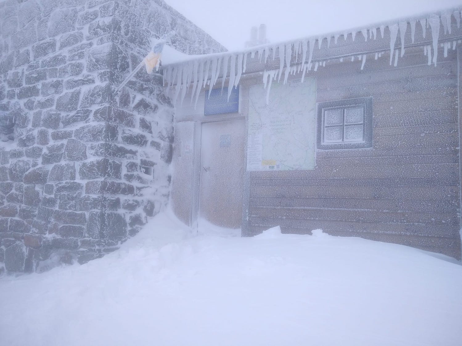 У понеділок вранці на горі Піп Іван Чорногірський спостерігалася хмарна погода з обмеженою видимістю через справжню заметіль: сніг продовжує падати, а схили обледеніли за температури -3 градуси. Також дме південно-західний вітер 11-12 м/с.