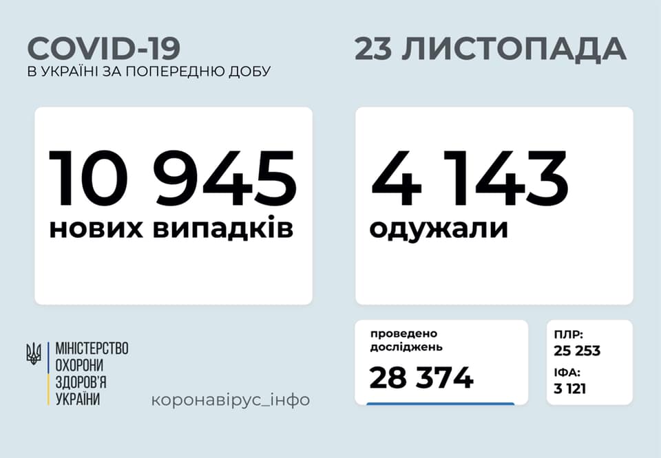 В Україні за минулу добу, 22 листопада, зафіксували 10 945 нових випадків коронавірусу.